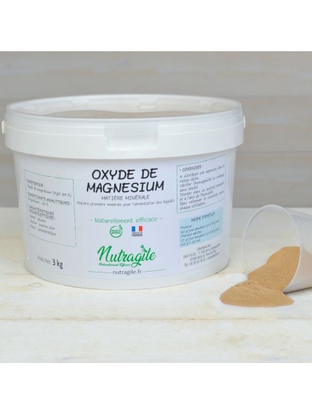 L’Oxyde de magnésium communément appelé Magnésie à pour formule MgO et se présente sous forme de poudre.