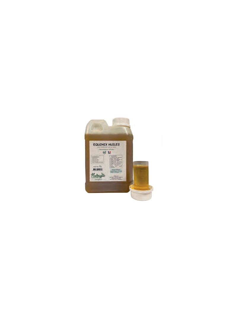 Equimix huiles est un mélange d’huile de lin, de colza, de maïs et de pépins de raisin.