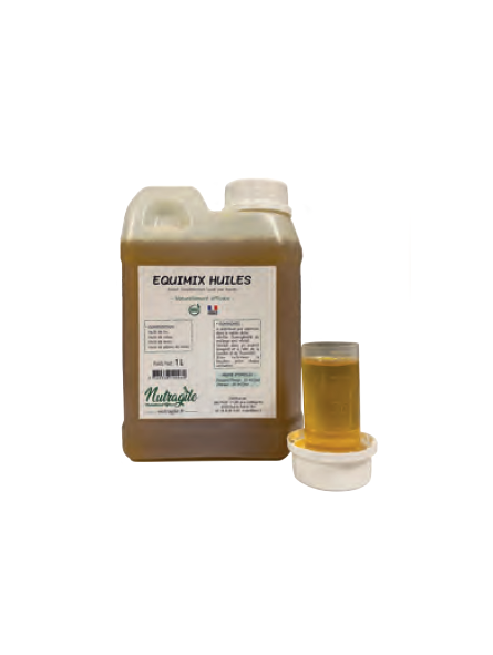 Equimix huiles est un mélange d’huile de lin, de colza, de maïs et de pépins de raisin.